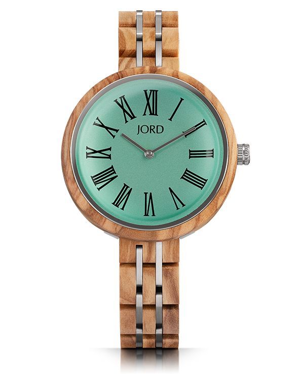 The Cassia is a timepiece that transcends the simple categorization of a watch. Intelligent design pairs with classic styling to create a piece worthy of your wrist and welcome in your jewelry wardrobe. The full Roman numeral concave dial in the JORD collection is beautifully reflected in our domed sapphire glass. The metal and wood link interlaced band integrates seamlessly into the rounded case. The Cassia Olivewood & Ocean Blue is the new classic, polished and perfect.